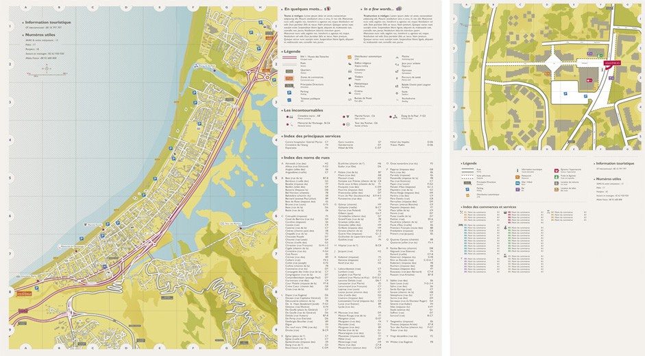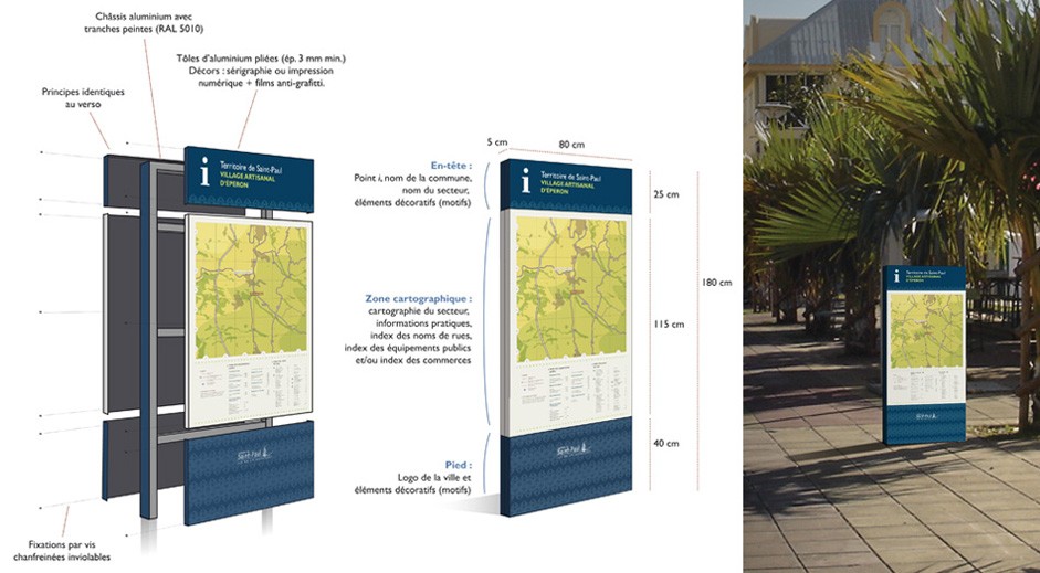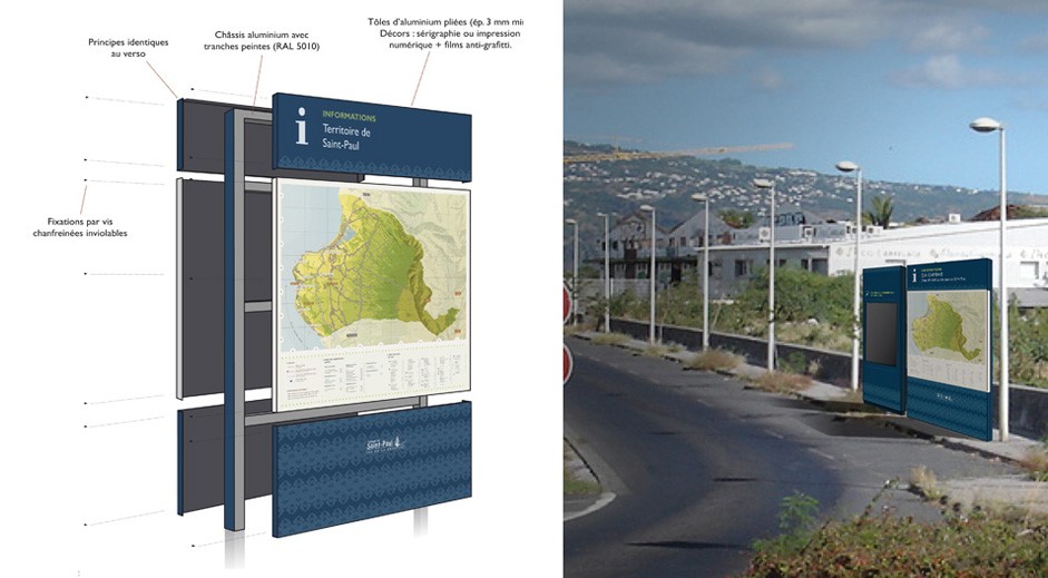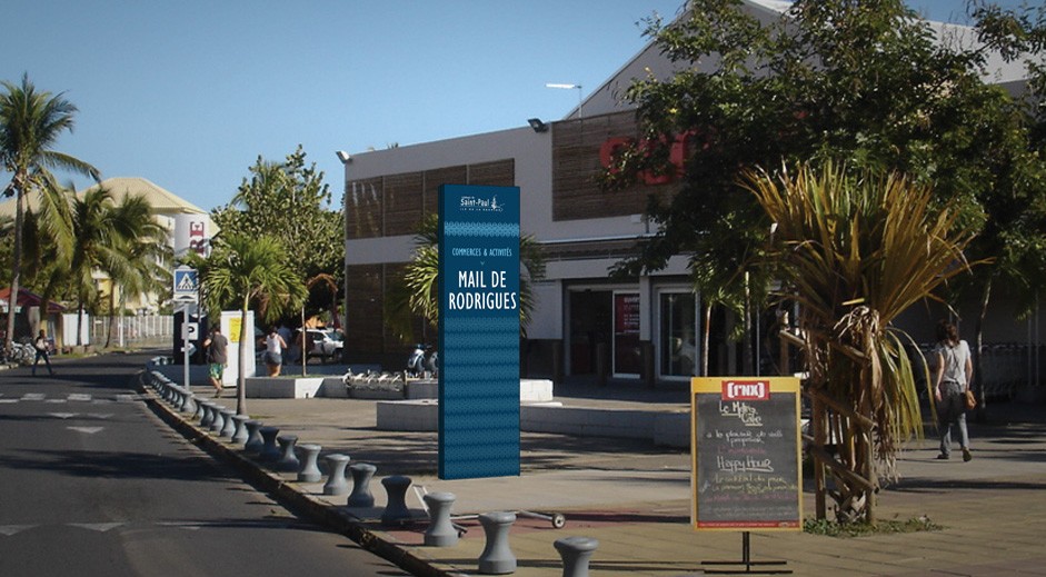 Conception des mobiliers et principes graphiques du programme de signalétique touristique et commerciale de la ville de Saint-Paul.