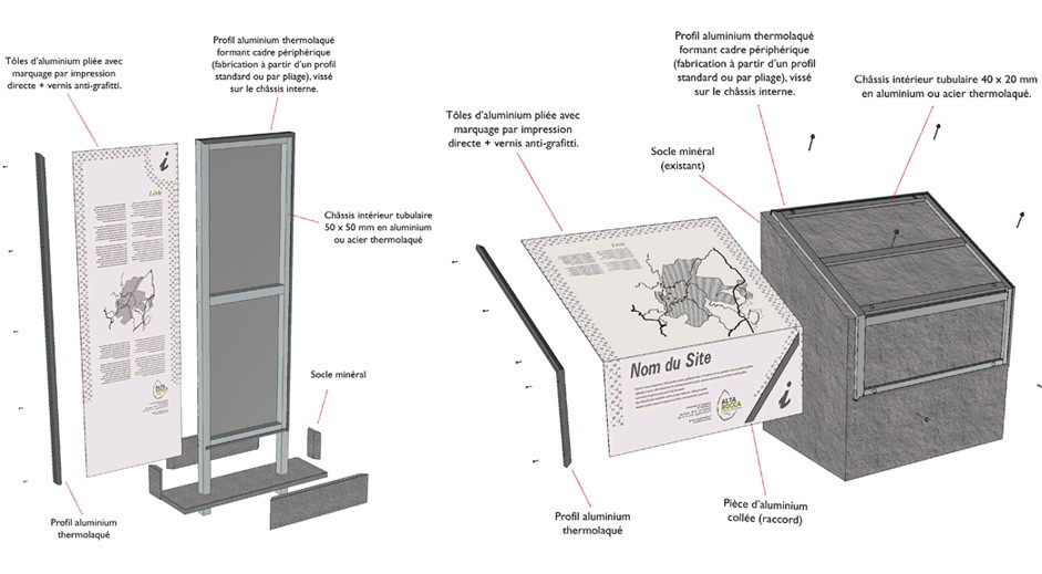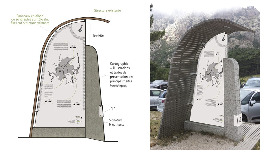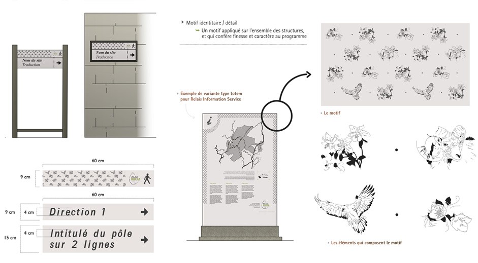 Marque, motif, palettes chromatiques typographiques, illustrations de supports et principes de mise-en-page pour Relais Information Service ou RIS, panneaux d’interprétation, tables de lecture, panneaux d’accueil et outils de jalonnement.