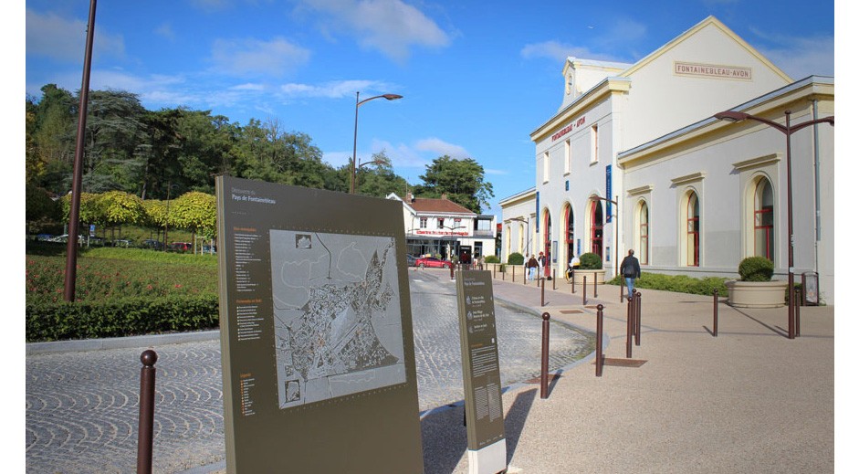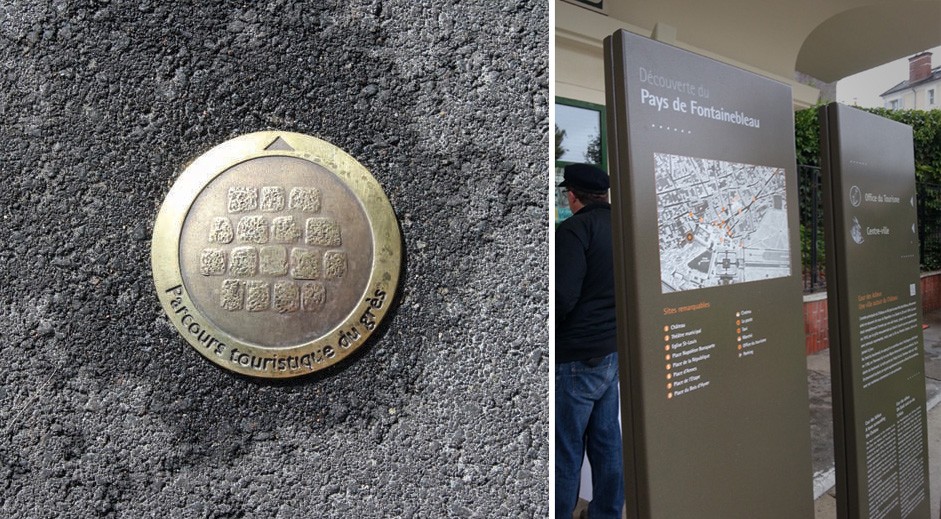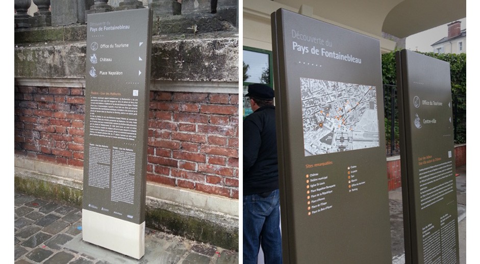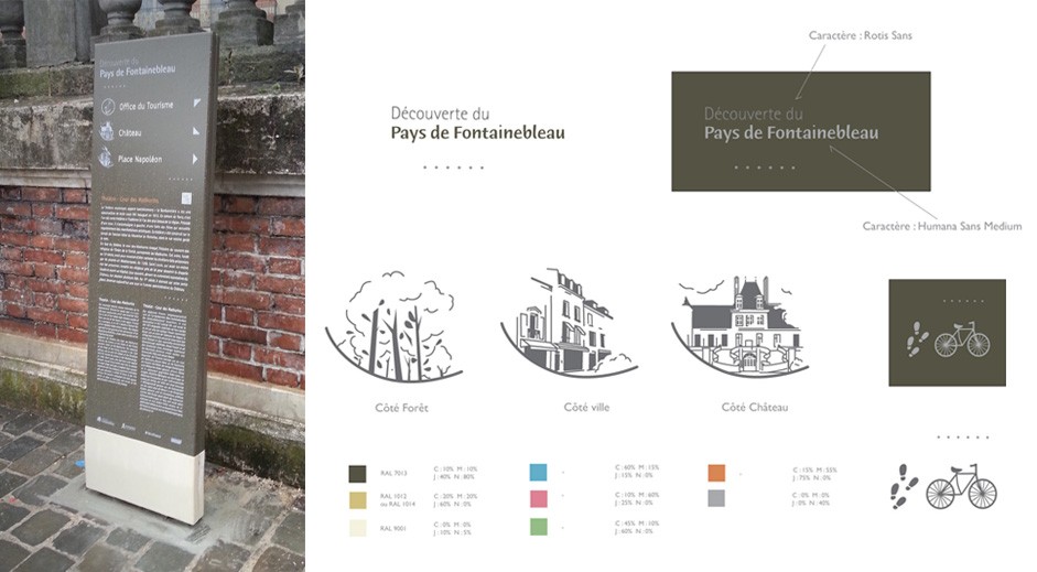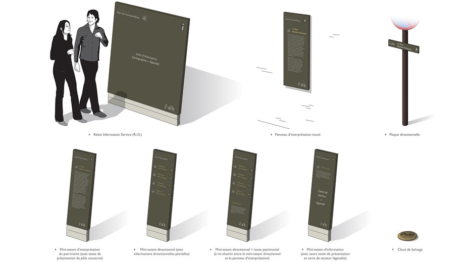 Conception des mobiliers et principes graphiques du programme de signalétique touristique du Pays de Fontainebleau.