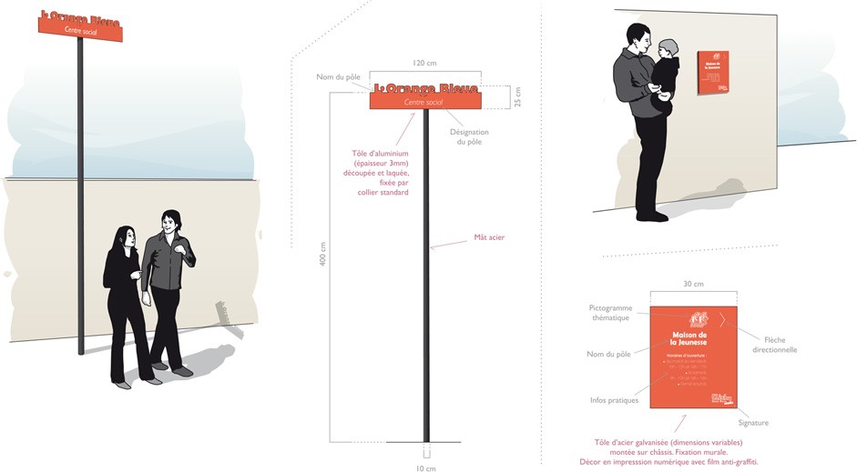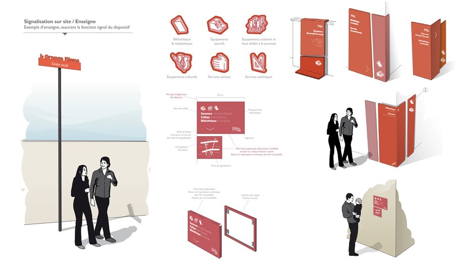 Conception des mobiliers et principes graphiques du programme de signalétique des équipements publics de la ville de Clichy-sous-Bois.